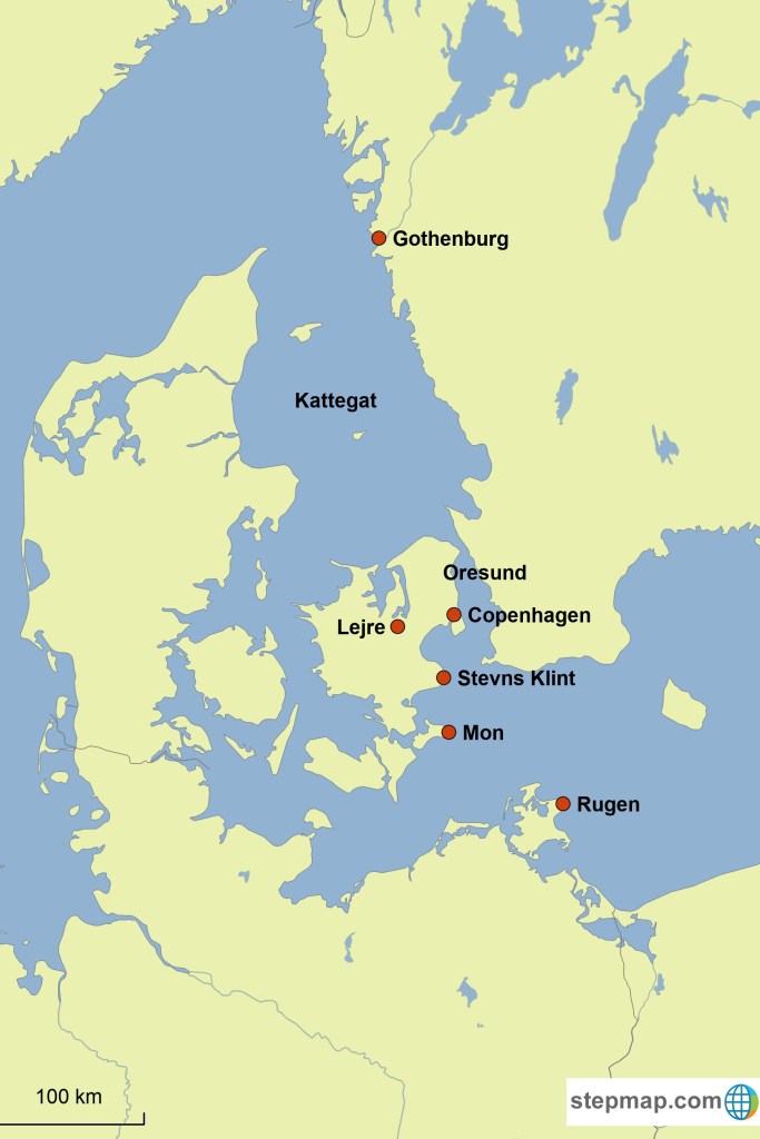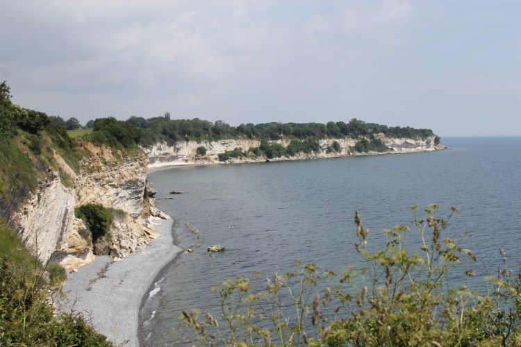 Archaeological excavations at Lejre have uncovered halls from the Scandinavian Iron Age and this has convinced many that Heorot could be found at Lejre but this does not seem to fit well with the description of Beowulf’s voyage. The initial description of the voyage is short. Beowulf orders a boat to be prepared and sets off from beneath the sea cliffs. On the second day he sights land – sea cliffs, broad headlands and high rocky shores. There are various translations of the appearance of the sea cliffs. They are said to shine, are sunlit, or are silvery (according to Tuso, Heaney and Chickering respectively). When these landmarks are reached the poem is quite clear – their journey is at an end. Beowulf and his crew are escorted a short distance inland from where Heorot can be seen in a prominent position. Unfortunately none of the features described can be seen on the approach to Lejre which is about 7km away from the end of the Iselfjord and Roskilde Fjord, about 50km away from the open sea. Although the description in the poem is short there is one feature that can narrow down the search. There aren’t many cliffs in Southern Scandinavia. The highest feature in Denmark is reputed to be the top of the bridge between Funen and Zealand but there are three locations within Southern Scandinavia that have chalk cliffs: Stevns Klint (Zealand in Denmark), Møns Klint (Island of Møn, Denmark) and Jasmund Peninsula (Rügen, Germany). There are also sandy cliffs on the north coast of Zealand but these don’t have the special qualities that have generated the various descriptions of the cliffs in the poem. The island of Bornholm has granite cliffs but again these could not be described as silvery or shining. If we make the assumption that the shining/sunlit/silvery cliffs are chalk cliffs we can say that Heorot lies within a few kilometres of one of these locations: