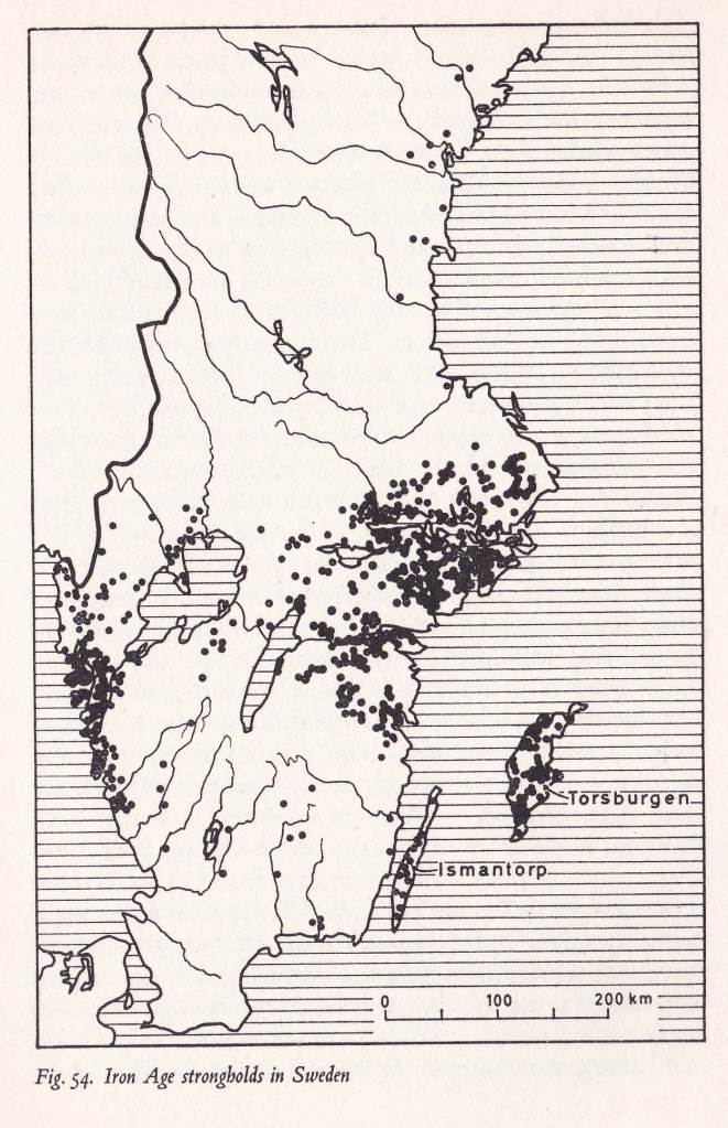 Beowulf is described as a Geat but the homeland of the Geats is a bit debateable. The two main contenders are the area around modern day Gothenburg and the island of Gotland to the east of Sweden. The map, taken from ‘Sweden’ by M. Stenberger shows Iron Age strongholds in Sweden and seems to indicate the presence of two distinct communities. The assumption I have made is that the Swedes are from the eastern part of Southern Sweden and the Geats are from the area around Gothenburg. We shall see later that there is some evidence for the homeland of the Geats in this area.